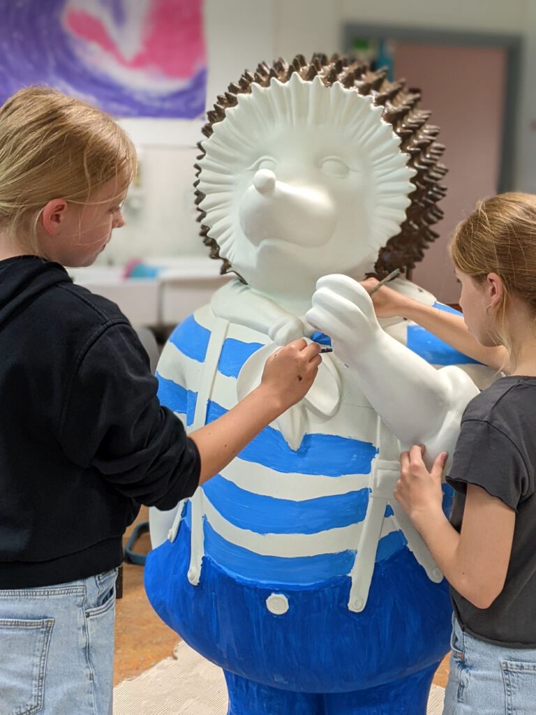 Ein besonders farbenfrohes Highlight bereichert seit Kurzem den Eingangsbereich der Aula: Zwei mannshohe Figuren des Märchenduos Hase und Igel– kunstvoll gestaltet von unseren Schülerinnen Lara, Skadi und Paulina aus der jetzigen 6. Klasse.