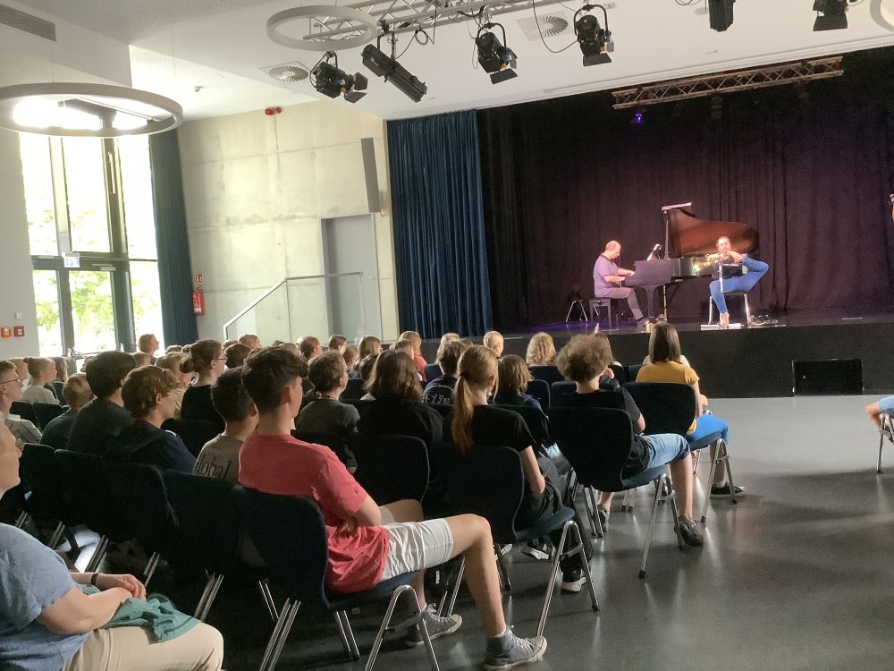 Schülerinnen und Schüler verschiedener Jahrgangsstufen waren zu Gast in der Aula und konnten zwischen den Stücken und am Ende des Konzerts Fragen an den Hornisten und den Pianisten stellen.